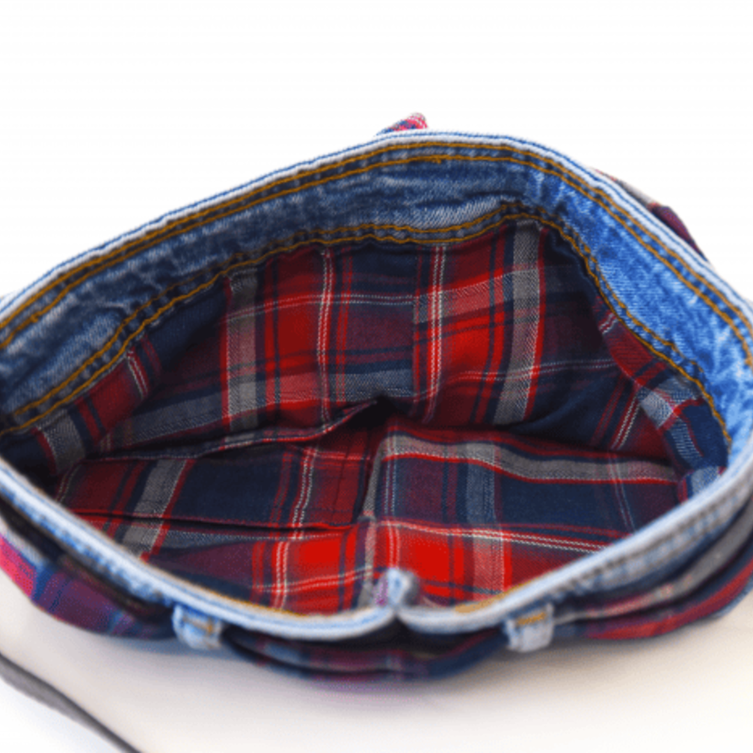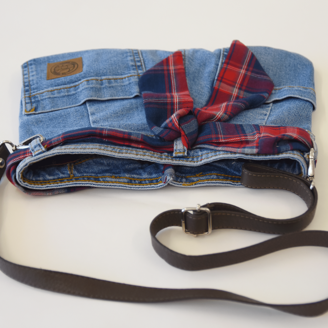 El diseño aprovecha materiales reutilizados, transformando antiguos jeans en un bolso moderno y versátil. El detalle distintivo: un cinturón de tela escocesa en tonos rojos y azul marino que rodea la parte superior del bolso, aportando un look vintage y desenfadado. Este toque artesanal hace que cada pieza sea irrepetible.