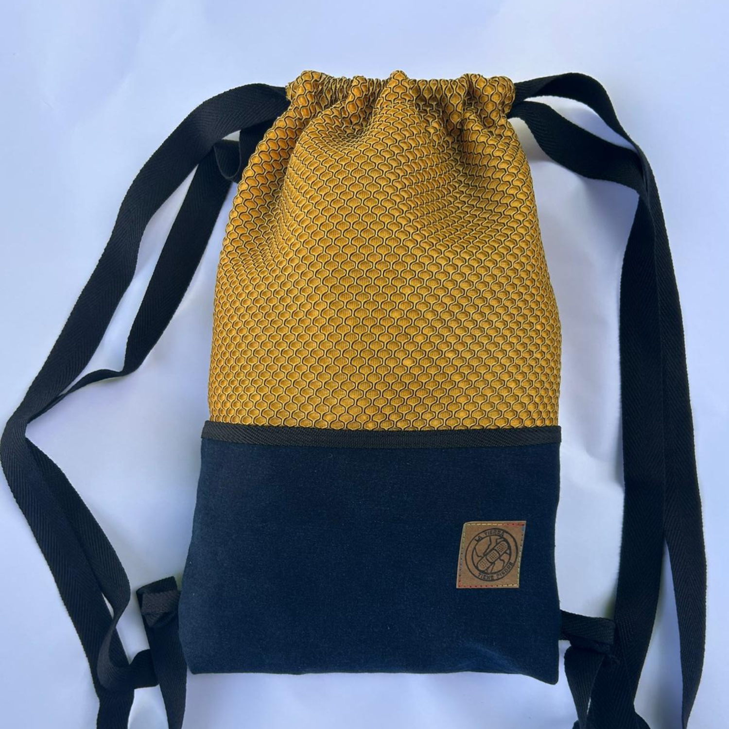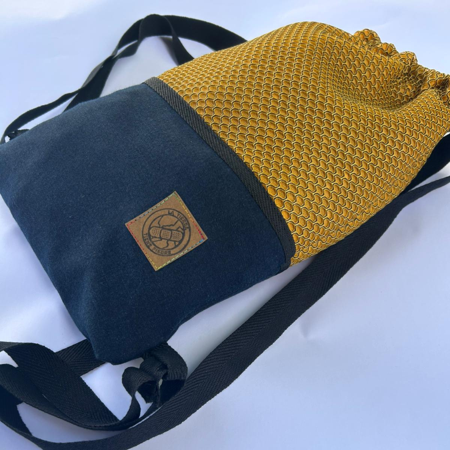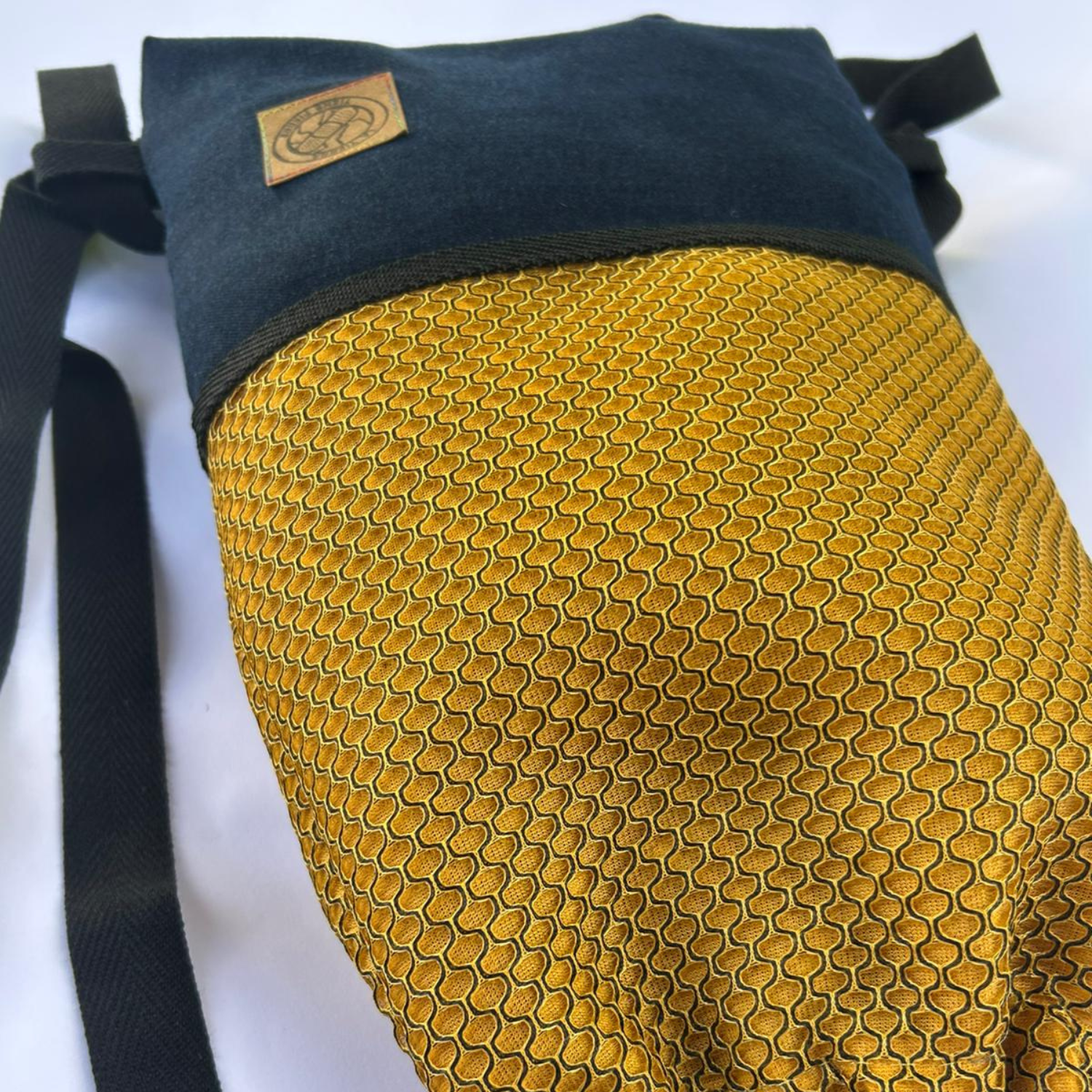 Mochila confeccionada artesanalmente en Irún con un mínimo del 75 % de materiales reciclados. Combina base de tejido vaquero azul con parte superior en malla transpirable color naranja. Su cierre mediante cintas de algodón de 2,5 cm ofrece comodidad y estabilidad. Diseño vibrante, resistente y ligero, pensado para un uso diario responsable dentro del proyecto La Tierra Tiene Fiebre.