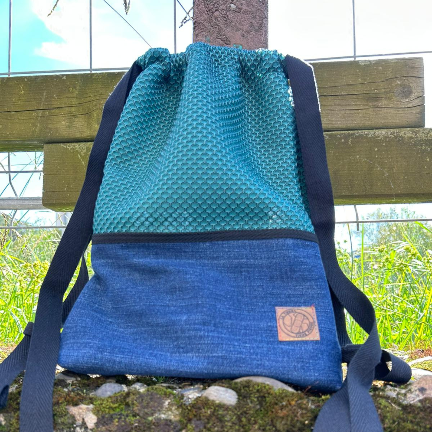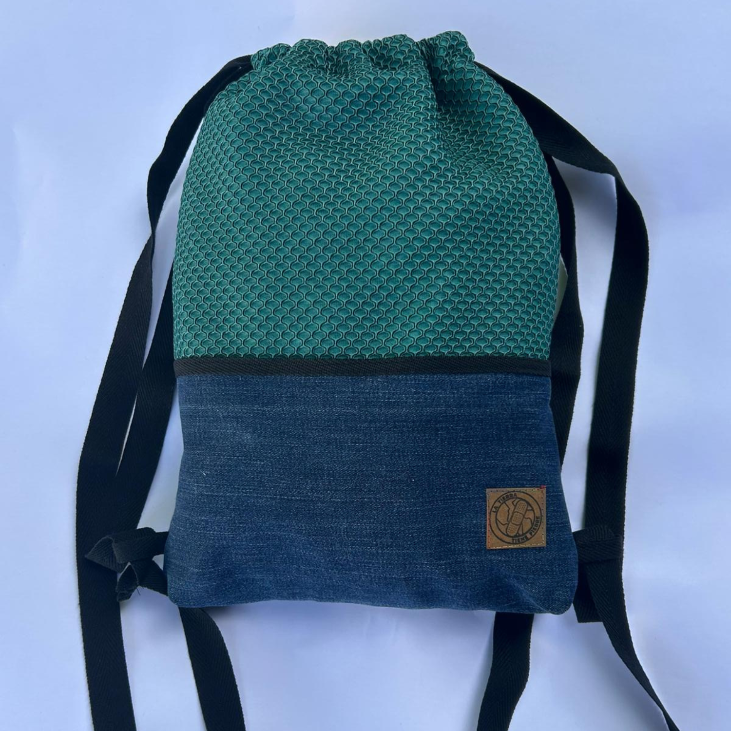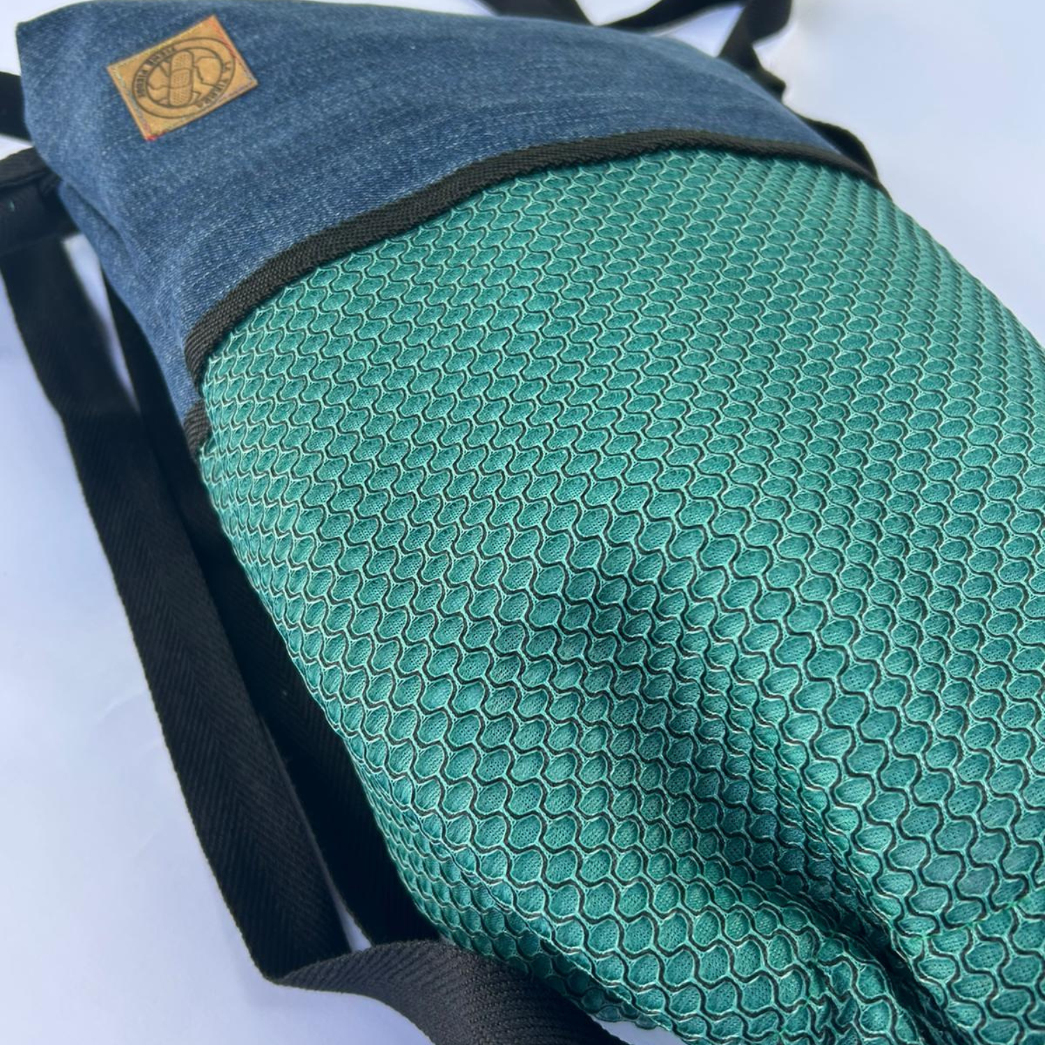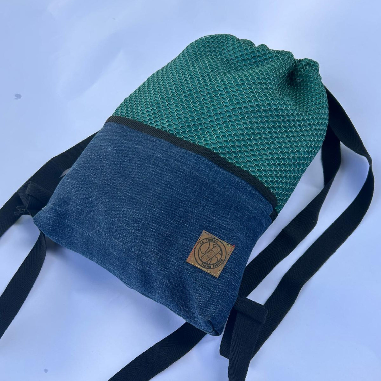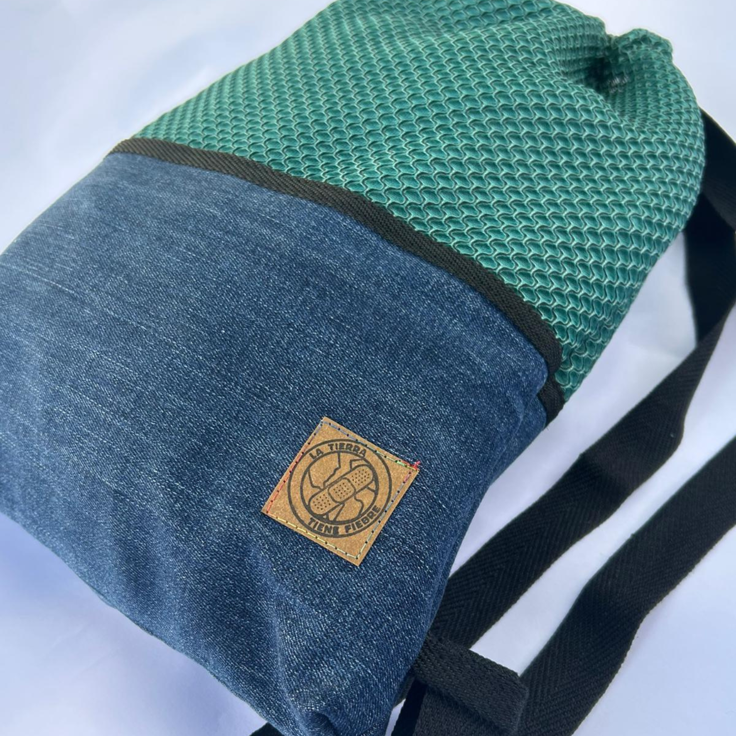 Mochila artesanal elaborada en Irún con un mínimo del 75 % de materiales reciclados. Combina base de tejido vaquero reciclado con parte superior en malla transpirable verde pasto. Las cintas de algodón de 2,5 cm proporcionan un ajuste estable y cómodo. Diseño resistente, ligero y versátil, perfecta para el uso diario o escapadas sostenibles dentro del proyecto La Tierra Tiene Fiebre.