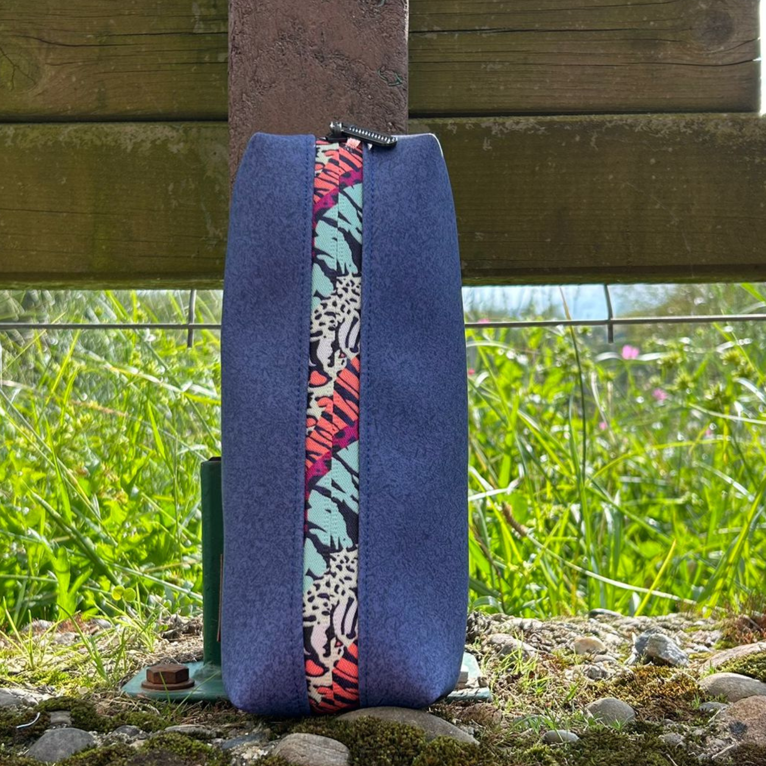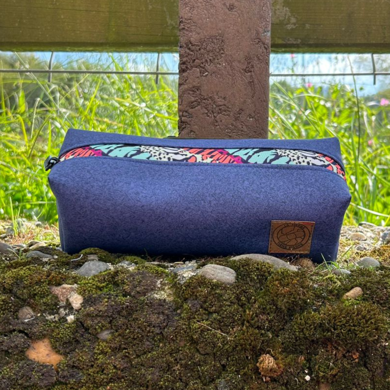 Estuche rectangular en tono azul tejano, confeccionado con materiales reciclados. Su estética sobria y urbana lo convierte en un accesorio práctico para el día a día. El contraste con la cremallera de colores y el parche de «La Tierra Tiene Fiebre» aporta personalidad y refuerza su compromiso con el diseño sostenible.