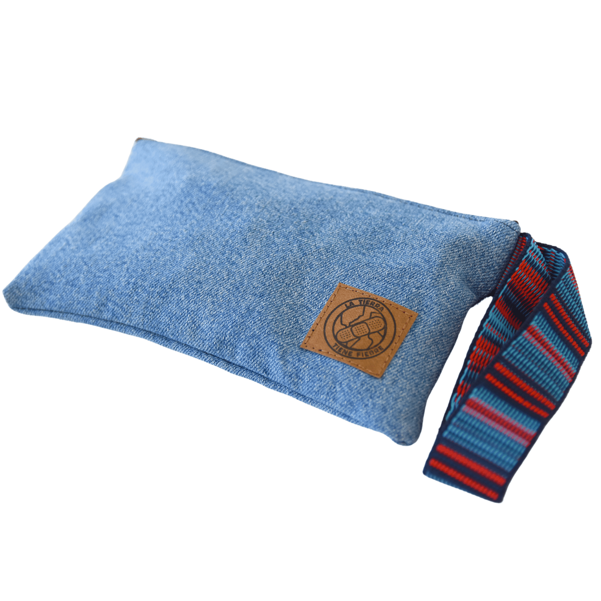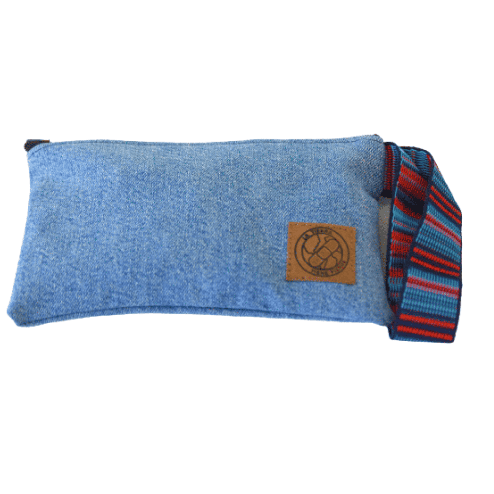 Neceser de tela vaquera con compartimiento interior, todo el neceser está hecho de pantalón vaquero recuperado.