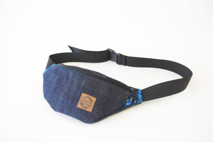 Diseño compacto, estilo urbano y conciencia ecológica. Esta riñonera está hecha con mezclilla reciclada de color oscuro y detalles únicos tipo galaxia en los laterales. Ideal para llevar lo esencial con estilo y comodidad.